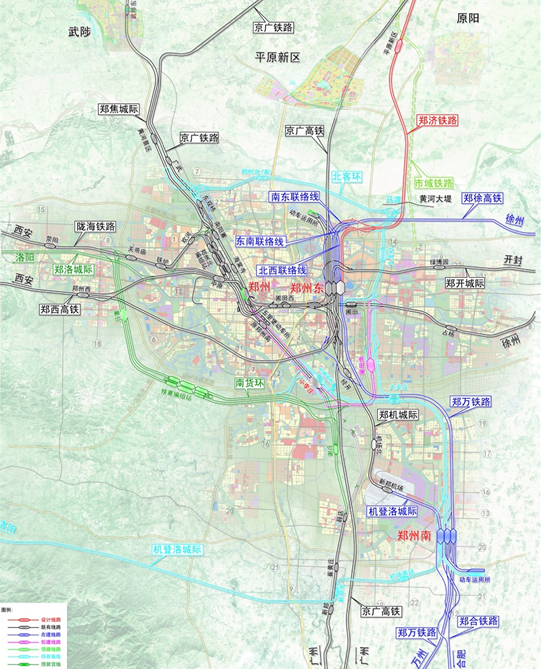 (四)合理选择联络线设置及接轨方案,实现郑州枢纽互联互通,临近既有运营高铁要求高。郑济铁路引入郑州枢纽,需设置联络线实现与徐兰高铁、京广高铁间的互联互通,对完善全国路网结构具有重要意义;引入新乡枢纽新乡东站,需合理确定与京广高铁合理的并场线间距,降低对既有京广高铁的影响。既有京广、徐兰高铁为350km/h的高速铁路,高峰时每5分钟通过一趟高速列车,运输十分繁忙,沉降控制要求极高。