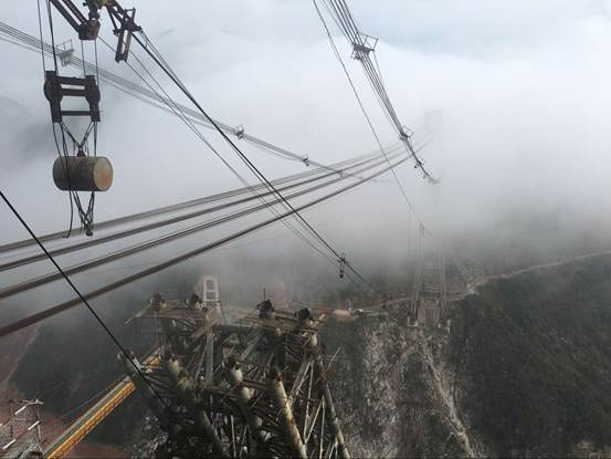 澜沧江特大桥为主跨342m的上承式劲性骨架钢筋混凝土提篮拱桥,距江面200余米,横跨大理岸和保山岸。为了保证桥梁顺利施工,中铁咨询勇于创新,首次采用二次竖转施工工艺,即在钢管拱竖转到位前,拱肋劲性骨架分两部分在大理岸和保山岸完成拼装,先将上部分拱肋扳起,完成半跨拱肋连接,再向下竖转,最后两侧合龙完成拱肋劲性骨架施工。澜沧江特大桥单侧竖转重量达2500吨,下放重量世界第一,填补了国内及世界桥梁建设技术上的空白。